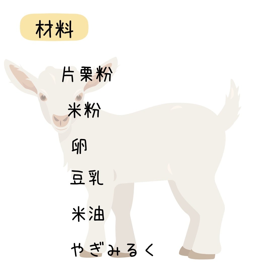 素材: 米粉、片栗粉、卵、豆乳、米油、やぎみるく