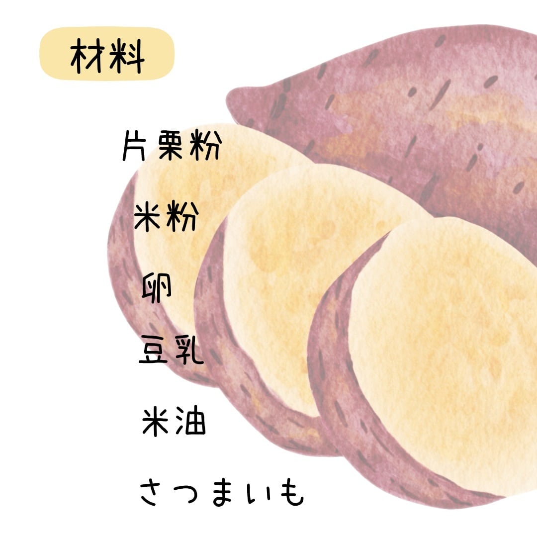 素材: 米粉、片栗粉、卵、豆乳、米油、さつまいも